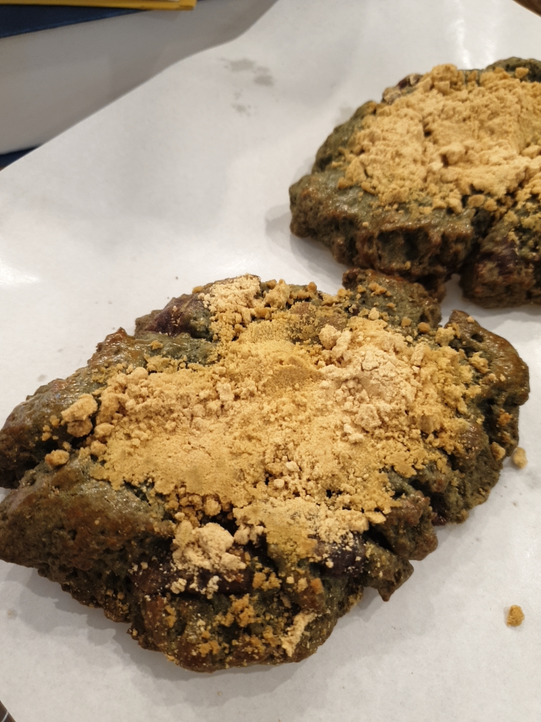 앙쑥인절미스콘 ㅋㅋㅋ 밑에 층은 앙금, 가운데 쑥스콘, 위에 인절미 가루 두껍게 ㅋㅋㅋㅋ