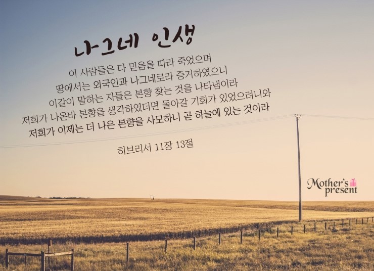 이 사람들은 다 믿음을 따라 죽었으며 약속을 받지 못하였으되 그것들을 멀리서 보고 환영하며 또 땅(earth)에서는 외국인과 나그네로라 증거하였으니 이같이 말하는 자들은 본향 찾는 것을 나타냄이라 저희가 나온바 본향을 생각하였더면 돌아갈 기회가 있었으려니와 저희가 이제는 더 나은 본향을 사모하니 곧 하늘에 있는 것이라 그러므로 하나님이 저희 하나님이라 일컬음 받으심을 부끄러워 아니하시고 저희를 위하여 한 성을 예비하셨느니라