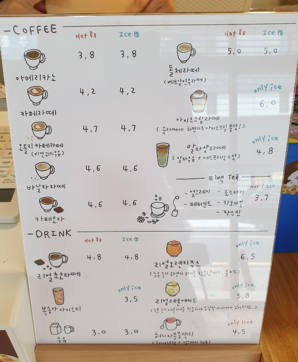 쿠키상점의 음료 메뉴판! 음료는 안마셨는데, 음료도 맛 괜찮다고 하는 분들 있더라구영